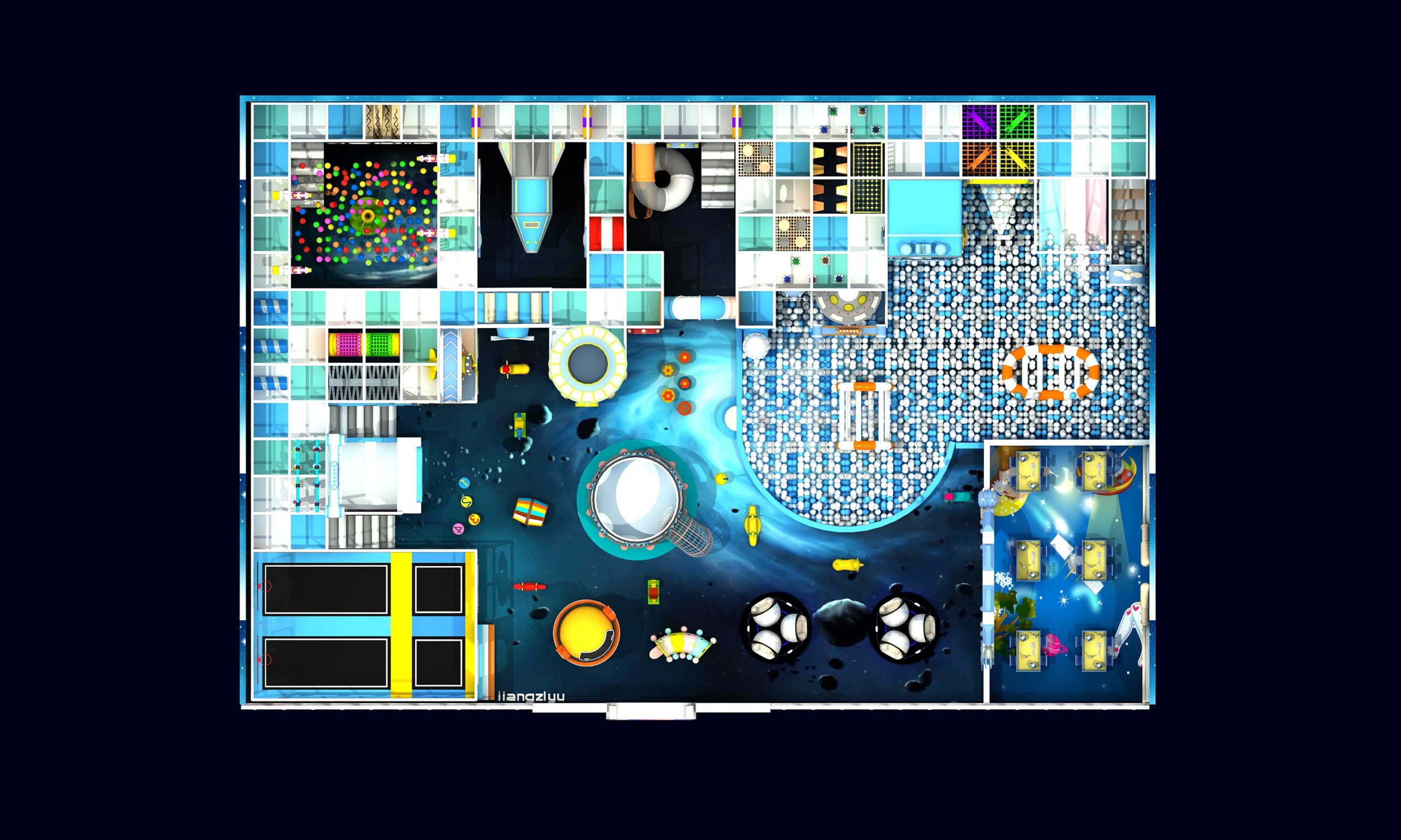 Detaillierte Beschreibung eines Indoor-Spielplatzes mit Weltraumthema: